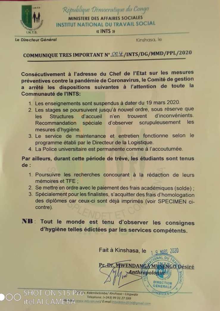 [Lire l’intégralité du communiqué de Directeur Général de l’INTS-Kinshasa ici]