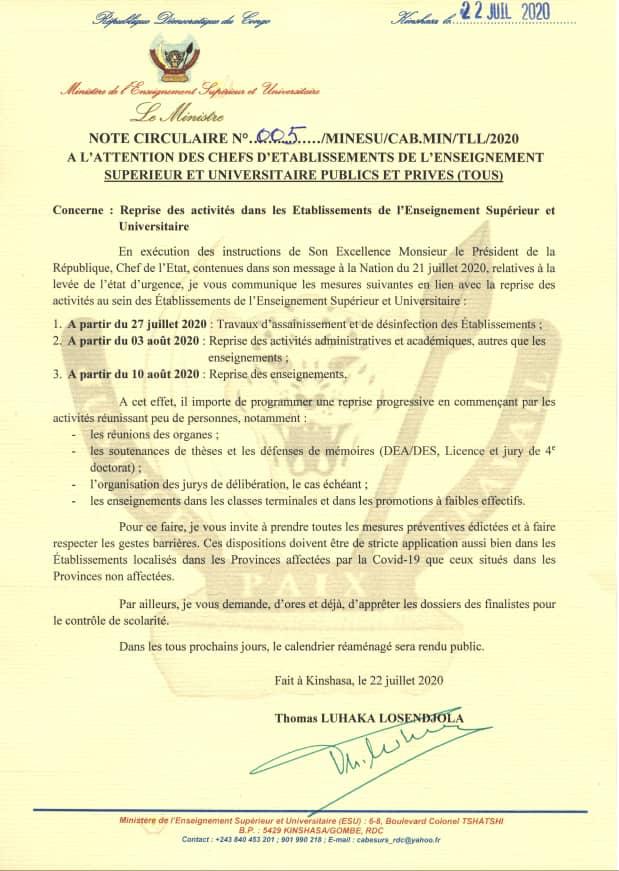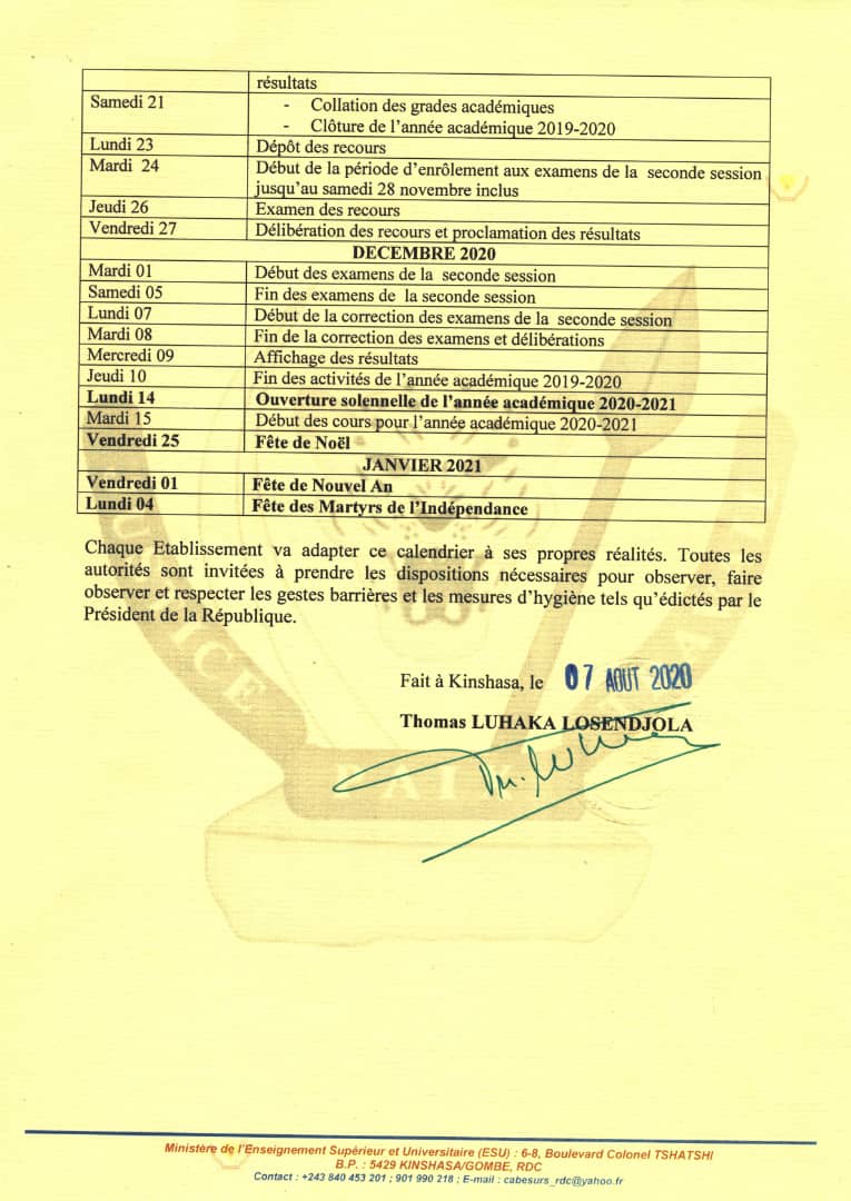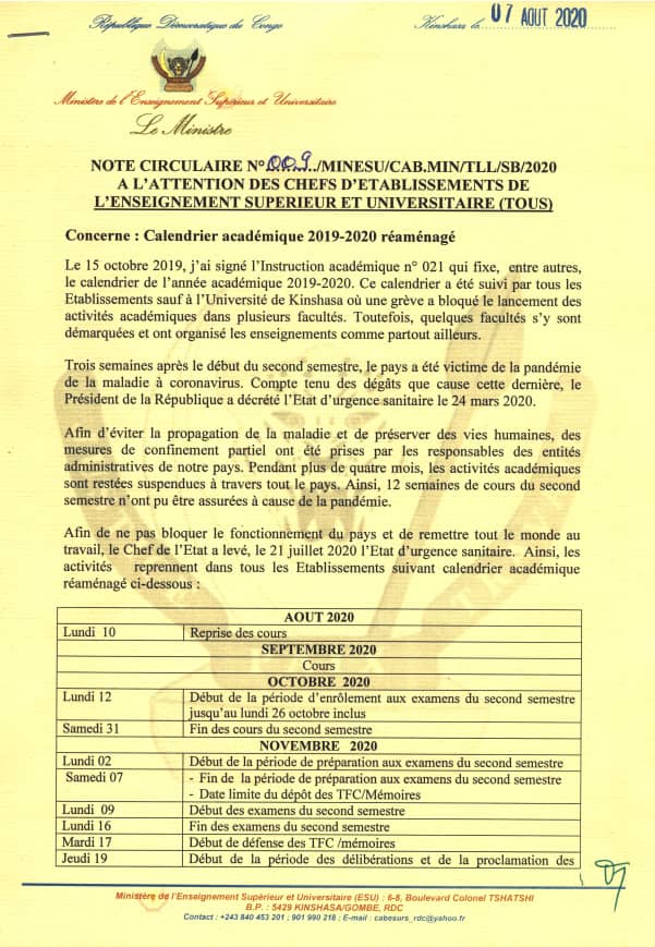 Actualités de l'INTS-Kinshasa LE MINISTRE DE L’ESU FIXE LA REPRISE DES COURS AU 10 AOUT PROCHAIN (Calendrier académique 2019-2020 réaménagé)