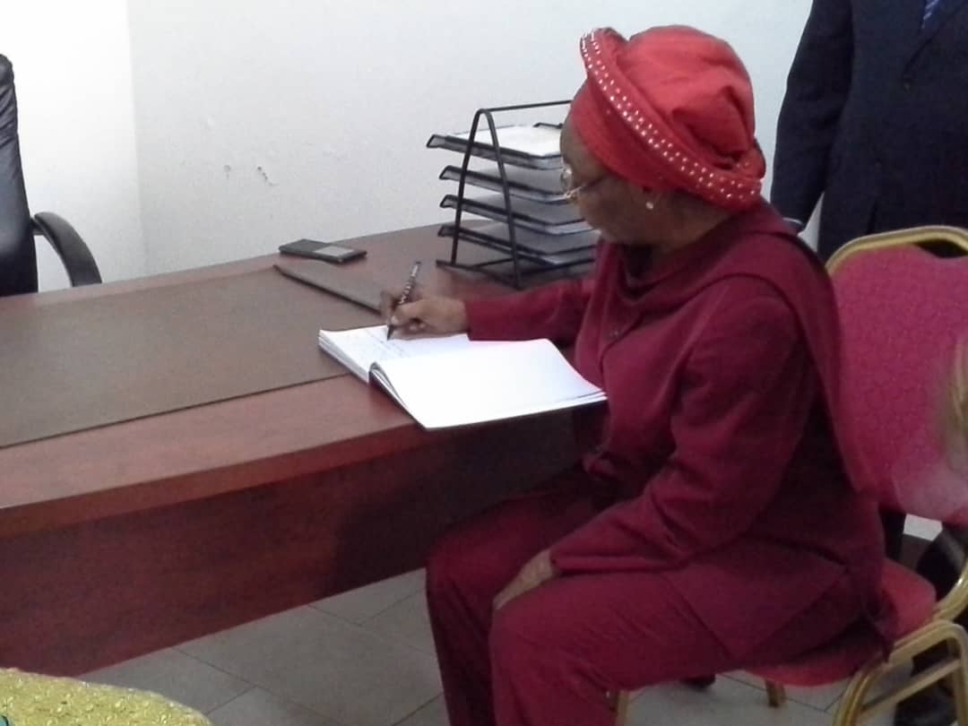 Signature du livre d’Or par Son Excellence Antoinette Dinga-Dzondo Ministre des Affaires Sociales du Congo Brazzaville pour un partenariat INTS-Kinshasa et INTS-Brazzaville.